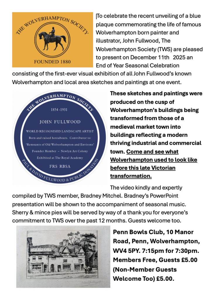 We are celebrating the unveiling of a blue plaque commemorating the life of famous Wolverhampton born painter and illustrator, John Fullwood, with the first-ever visual exhibition of all his known Wolverhampton and local area sketches and paintings.